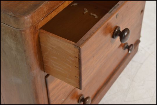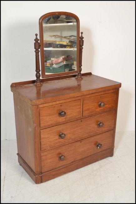 A Victorian mahogany dressing chest of drawers being raised on a plinth base with short and deep drawers having knob handles. Swing mirror atopMeasures: 50cm high x 99cm wide x 44cm depth.