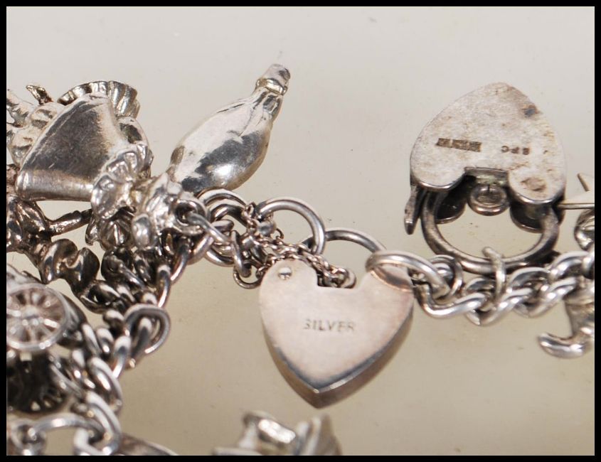 A vintage silver hallmarked charm bracelet having heart padlock clasp with an assortment silver charms to include ark, heart, buddha, shoes, monkey, viking ship, toby jug, coffee pot, cat, house, money bag etc. Some opening to reveal decorative innards. Gross weight 107g. Measures 6.5 inches long.
