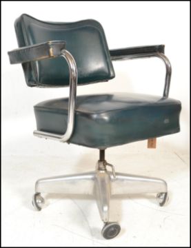 An industrial vintage 20th Century factory work revolving desk chair, over stuffed seat pad and backrest raised on a tubular chrome open  frame, circular quadruped base terminating on castors. Measures: 81cm high x 62cm wide x 65cm depth