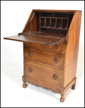 A 1920's solid oak ladies writing bureau. Of thin upright form being raised on stub cabriole legs with claw and ball feet. Above, the central bank of drawers under fall front bureau having appointed interior set within. Measures 102H x 61W x 40D.