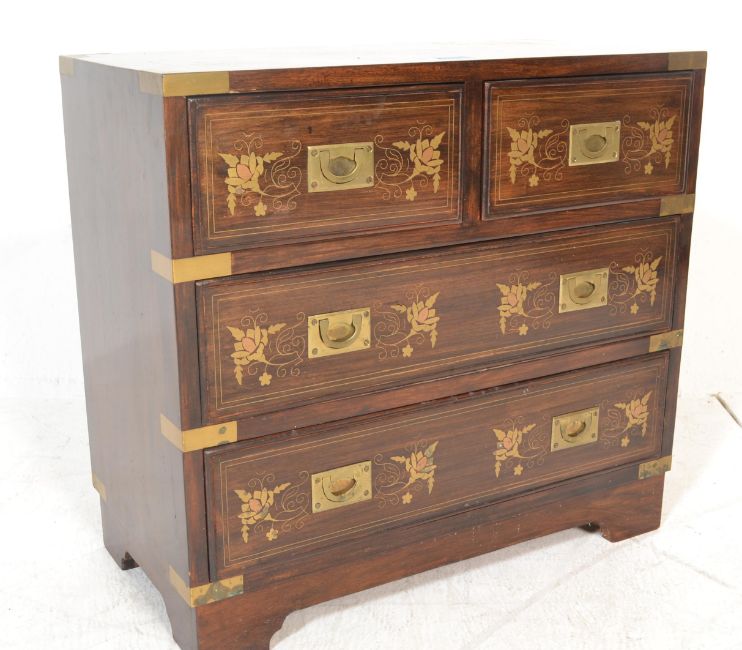 A 20th century antique style mahogany campaign chest of drawers. The chest with brass bindings and brackets with inset brass campaign handles with short and deep drawer configuration. Dimensions are 56cms h x 52cms w x 30cms d.
