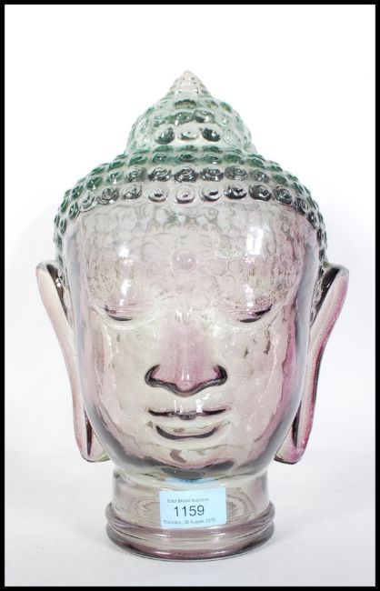 A vintage retro 20th Century glass Buddha head featuring beaded head dress with moulded features. Measures 29cm tall by 20cm wide ( Shop haberdashery display )
