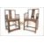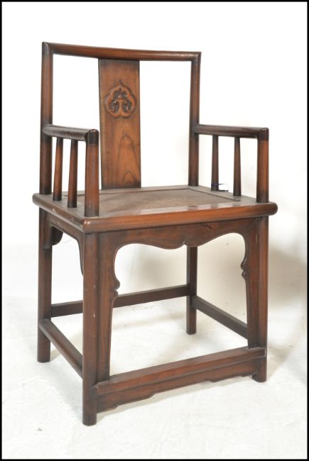 A pair of believed 19th / 20th century Chinese armchairs / elbow chairs. One having solid seat pad with the other being elm with rush seat centre. Both having small carved decorated back supports flanked by shaped elbow rests.All raised on square rounded supports united by stretchers. Biggest measures 94cm tall by 56cm wide.