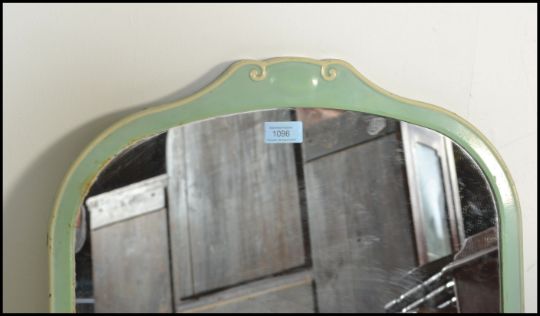 A 1920's Art Deco mirror finished in green having shaped dome top raised on music note feet. Measures 76cm tall by 24cm wide.