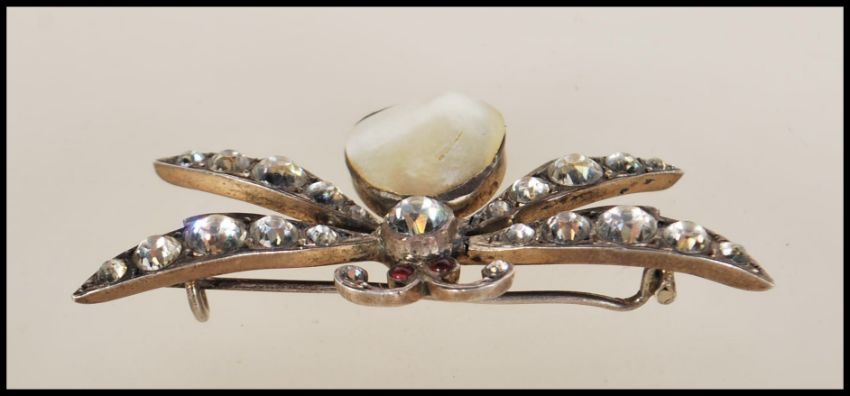 A late 19th / early 20th Century Victorian silver white metal bug brooch set with white paste stones, a pearl body and red stone cabochon eyes, having a hinge pin to the verso. Measures approx 6 cm wide. Weight 12.2g.