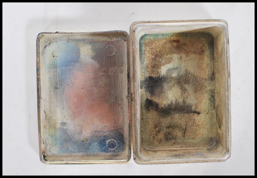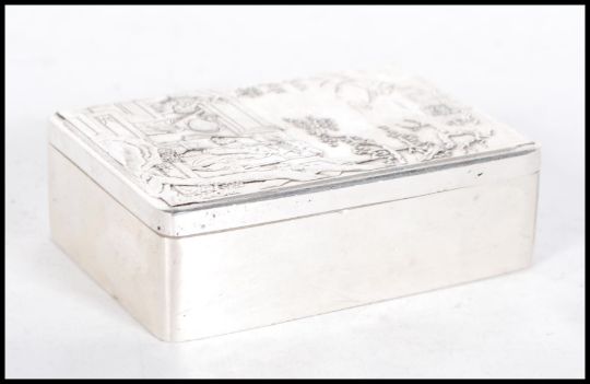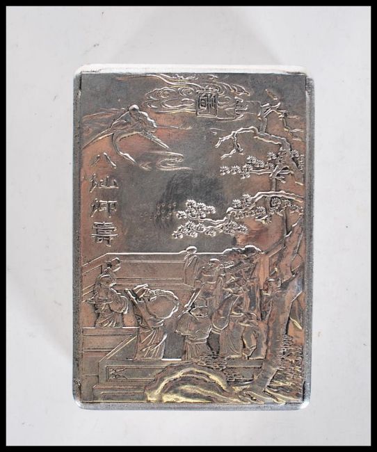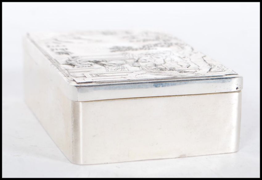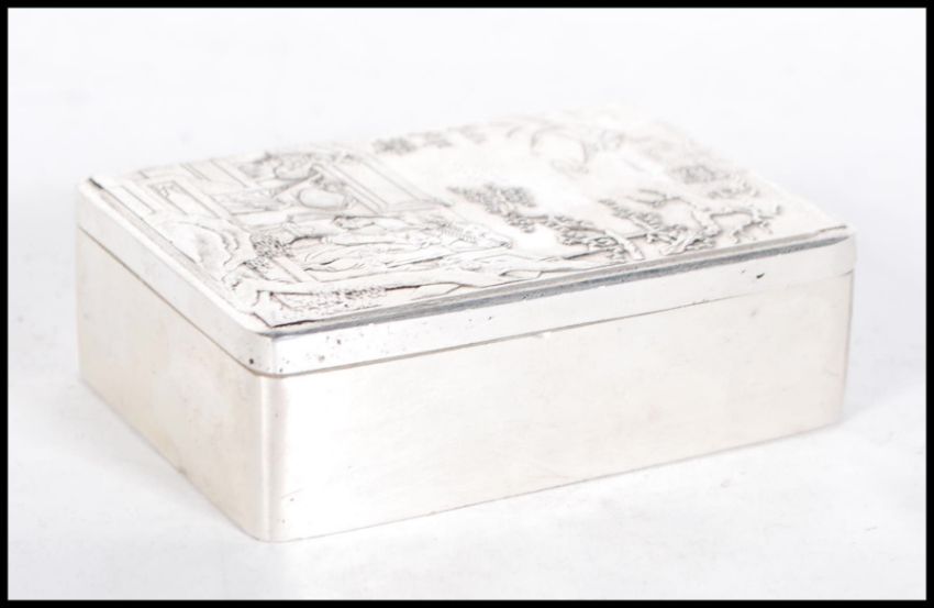 A silver white metal Chinese trinket box, the lid having relief oriental scene decoration depicting warriors below a tree in a courtyard looking up at the sky to a figure riding the back of a crane. Character marks to front. Weighs 702g.  Measures 3.5cm tall by 7cm wide and 10cm deep.