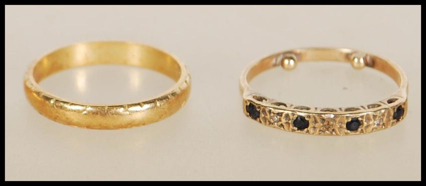 An 18ct gold band ring being Birmingham hallmarked having rubbed decoration to the outside of the band. Sponsors mark CG&S. Size  / Weight 2.8g. Together  with another 18ct gold diamond solitaire ring with platinum set low point diamond. Size L.5 / Weight 2.05g. Also a 9ct gold, sapphire and diamond 7 stone ring. Size L / Weight 1.92g and a 9ct signet ring ( af) weight 1.7g