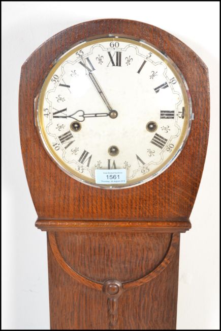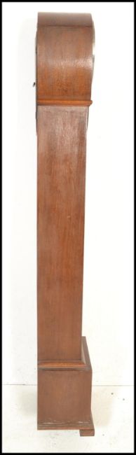 An early 20th Century Edwardian oak cased long case grandmother clock having a round white enamelled face with Roman Numerals to the chapter ring and pierced decoration hands. Raised on a plinth base with column trunk. Measures 135cms x 24cms.