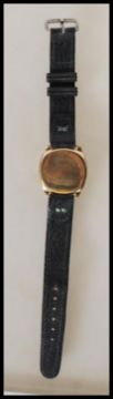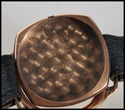 An early 20th Century 9ct gold cased gents wrist watch circa 1934, retailer stamp to the face for Walker and Hall Ltd, Arabic numerals with seconds subsidiary dial, set to a black leather strap. Engraved to verso.