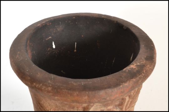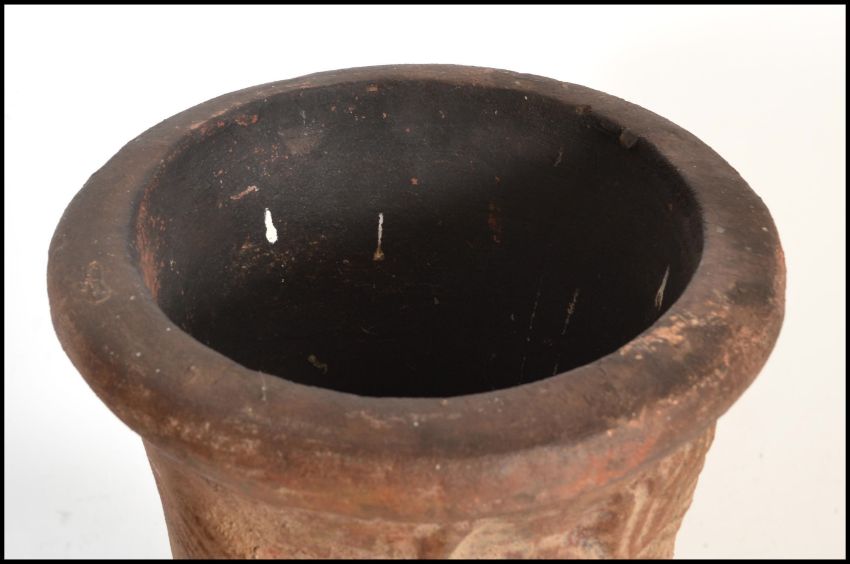 A 20th Century garden terracotta / clay tall Chiminea of bulbous form, set on a scroll work metal stand, with large opening to the front and removable lid to top of flue.