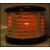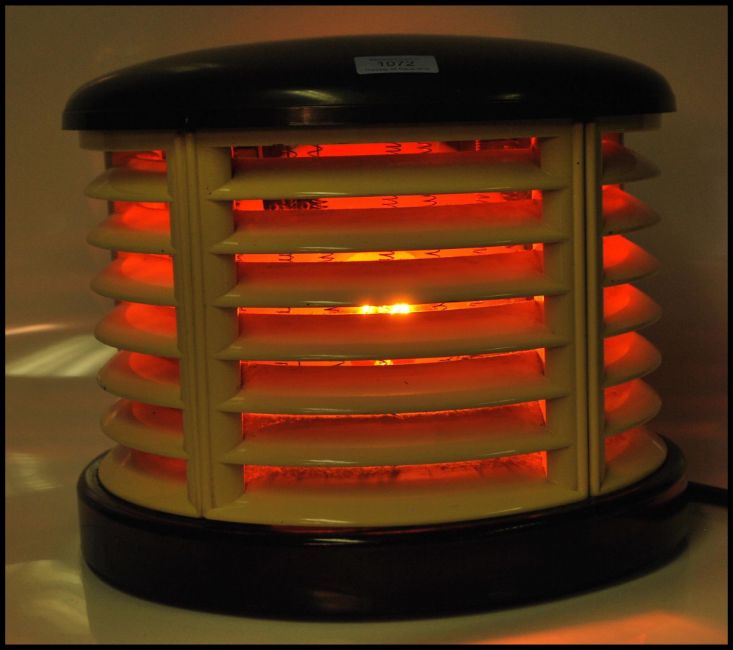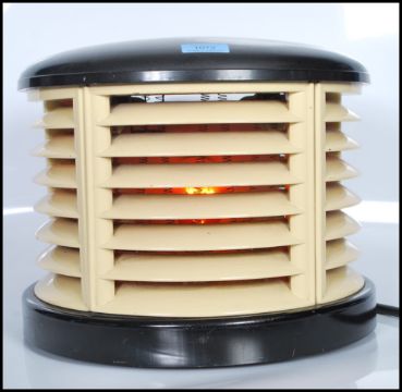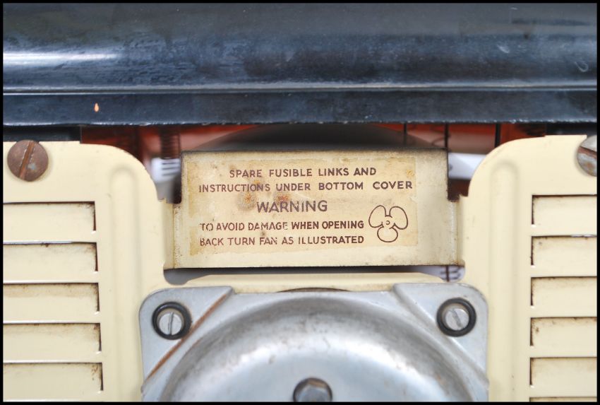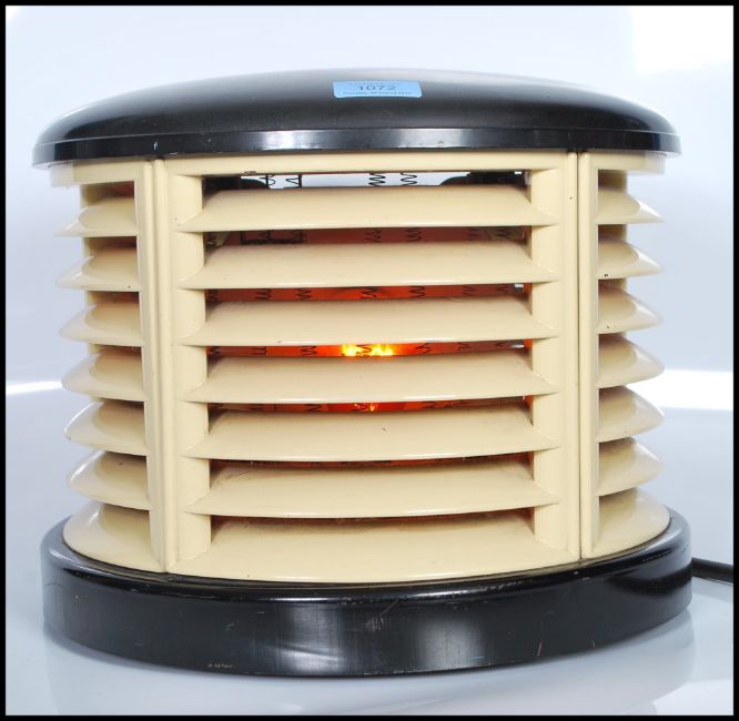 A post war Art Deco  century HMV 'Cavendish' demi-lune electric fan heater having bakelite top and bottom, finished in cream and ebony. Measures 26cm tall by 33cm wide.