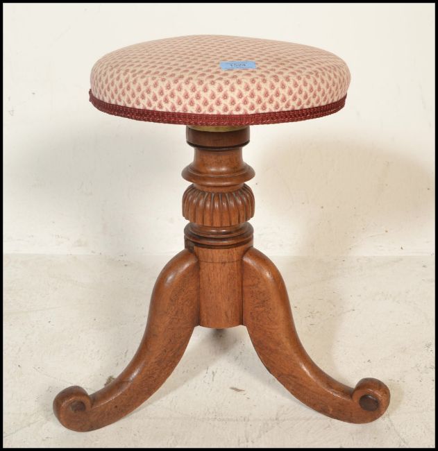 A Victorian 19th century mahogany revolving piano stool. Mid 19th century having an upholstered revolving top upon a turned column and raised on tripod legs. Stool 35cm diameter.