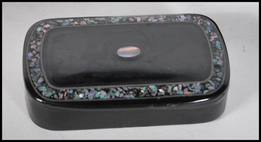 A selection of 19th Century snuff and patch boxes to include three boxes of rectangular form constructed from horn, two having tortoise shell lids, a lacquered snuff box with abalone shell borders, and a small lacquered box having a painted scene of carriages to the lid.