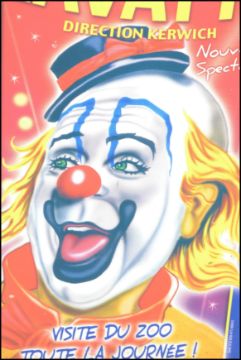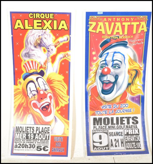 Two French point of sale advertising circus signs, the signs with notation for Cirque Alexia and Anthony Zavatta with clowns and performing horse to the front. Measures: 120cm high x 53cm wide.