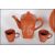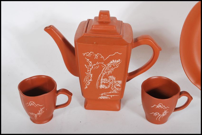 A 20th Century Chinese red clay Yixing tea for two service consisting of square teapot and two cups on tray. Having impressed decoration throughout of mountains and waterfalls with character marks. Teapot measures 16cm tall.