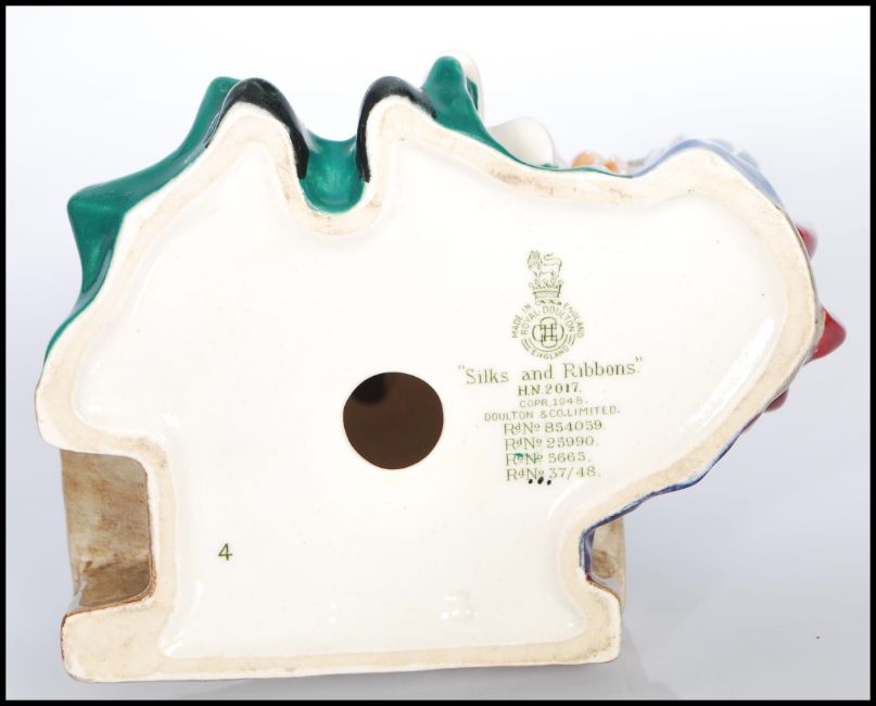 A Royal Doulton porcelain figure 'Silks and Ribbons ' no HN2017 depicting an old lady sat on a bench with a basket of ribbons. Being stamped to the base in green colour. Measures 16cm high.