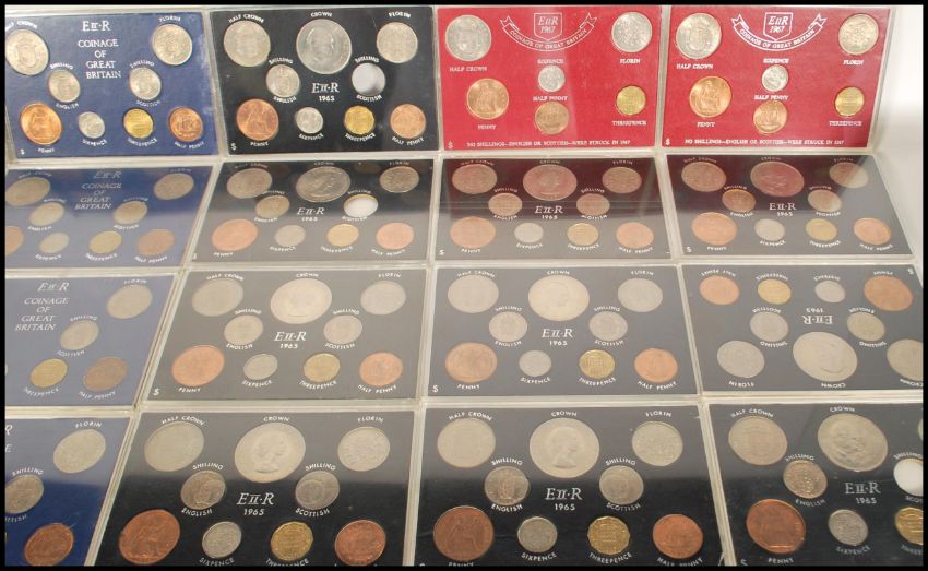 A collection of cased Queen Elizabeth II Coinage Of Great Britain to include Crowns Of Great Britain dating from 1935 to 1965, coin sets from 1963 to 1967, many multiples 26 complete sets in total.