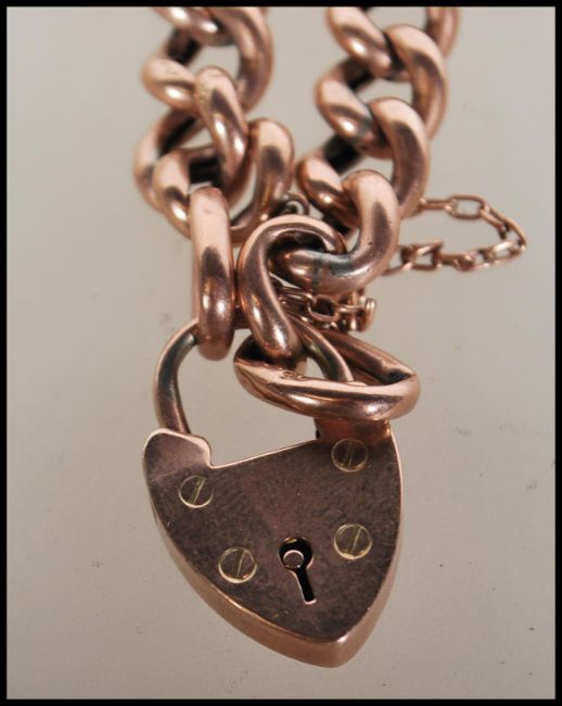 A hallmarked 9ct gold curb link heart padlock bracelet with a safety chain. Hallmarked Birmingham 1906. Weight 15.5g. Chain measures approx 8 inches.