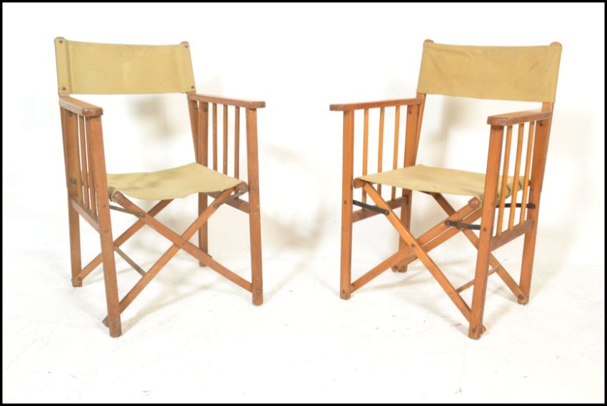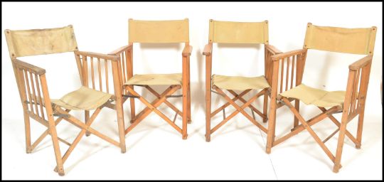 A group of four retro mid 20th Century wooden and canvas upholstered directors / garden chairs, having wooden armrest and canvas seat and backrest. Average size 90cm tall by 57cm wide by 52cm deep.