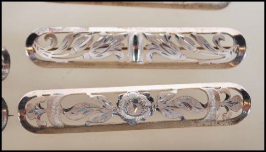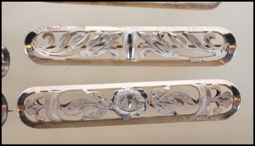 A selection of stamped 835 silver bar brooches having differing pierced floral decoration. Brooches measures 7cm wide. Weight 55.3g.
