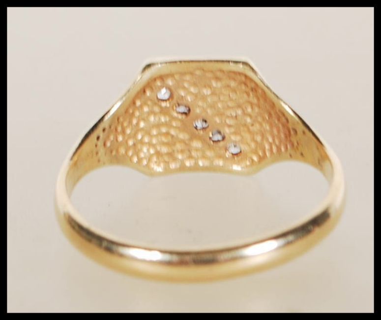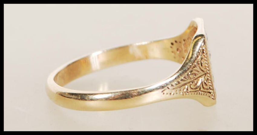 An unmarked 9ct gold signet ring having a square head having a row of white stones engraved with the letter A and scrolled decoration. Tests as 9ct gold. Weight 4.6g. Size Z+3.