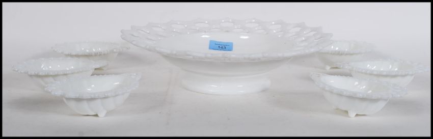 A 19th Century pressed milk glass centrepiece bowl having pierced decoration 'lace' rim, together with a set of six scallop shell dishes.