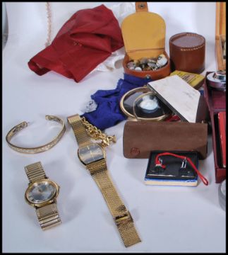 A collection of vintage costume jewellery and related items to include a Sekonda 1970's watch with a brown face and gilt baton numerals to the dial, an Accurist wrist watch with a silvered dial roman numeral chapter ring and date aperture, a good selection of vintage studs including some gold plated, a Hamon Fabrican cut throat razor, a selection of handkerchiefs including one embroidered with the RAF emblem, a Bezique and Rubicon Bezique game set, a collection of antique stamp presses, a Victorian wooden jewellery box etc.