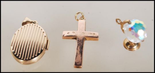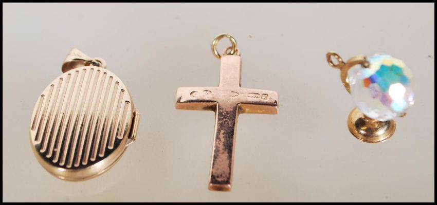 A group of three hallmarked 9ct gold pendants to include a locket of oval form with celtic knot design, a crucifix pendant with floral engraving, and a miniature globe pendant with a faceted globe. Total weight 4.9g.