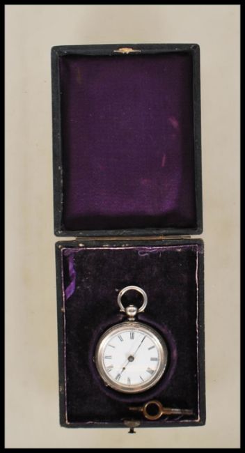A late 19th Century silver hallmarked open face pocket watch having engraved decoration to the case. White enameled face with Roman numeral chapter ring and faceted blue hands. Presented in original leather case. Hallmarked for Birmingham date letter K 1884, makers mark for Mojon & Montandon. Gross weight 43.7g. Face measures 27mm.