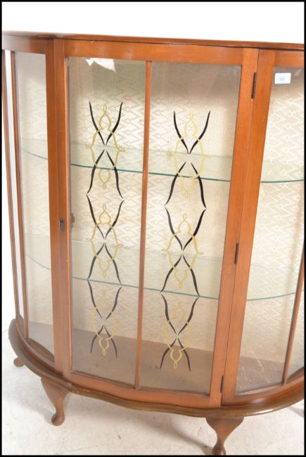 A mid 20th Century bow front mahogany Queen Anne revival display cabinet having glazed panels to the front with gilt scrolled decoration to the door, glass shelves to the interior being raised on cabriole legs. Measures: 108cm high x 100cm wide x 32cm depth.