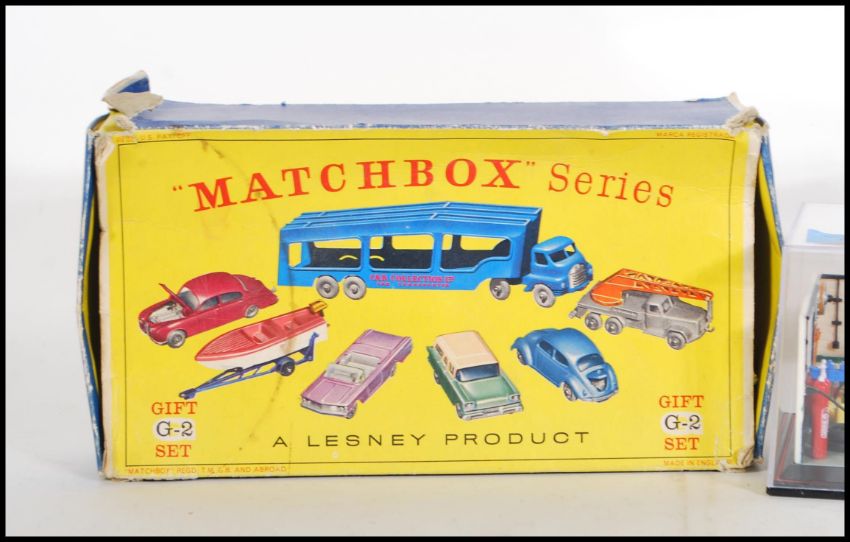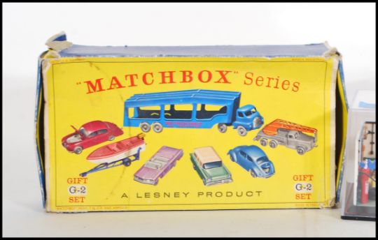 A vintage Matchbox Series gift G-2 Set partially complete with with five of the seven die cast models within, set still include Pontiac, Jaguar, Volkswagen, Ford station wagon and the speed boat trailer, together with a Dinky Volkswagen De Luxe Saloon, a mIni-rama toy garage, a Corgi ferrari Berlinetta, and Corgi toys Rolls Royce Silver Shadow.