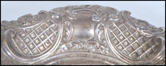 A 20th Century silver hallmarked pin dish of oval form having swirl and foliate embossed relief decoration. Hallmarked for Birmingham date letter F 1955, makers mark for A Marston & Co. Weighs 90.2g. Measures 2.5cm tall 15.5cm wide.