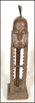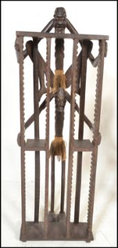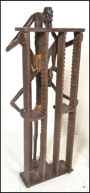 Two unusual 20th century carved African hardwood tribal upright CD rack stands. One in the form of a seated man, the other of naturalistic form, each with central cd racking. Measures: 190cm high x 45cm wide x 35cm depth.