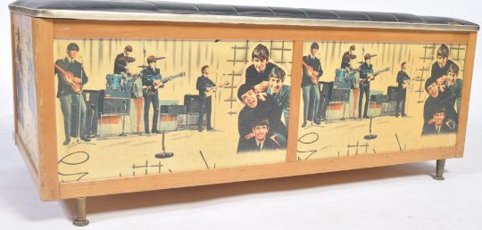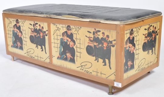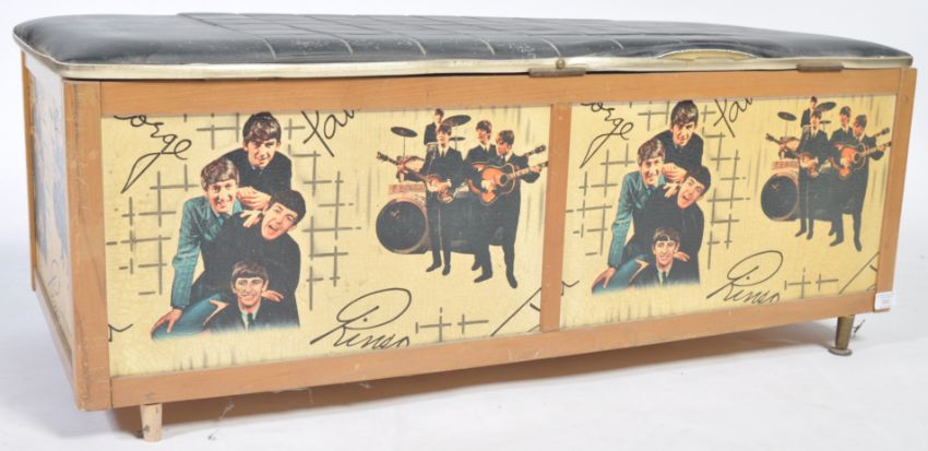 Avalon Yatton - The Beatles - A rare 1960's Beatles ottoman / blanket box. Vinyl padded hinged cover above panelled sides transfer decorated with images of the band and their facsimile signatures. Raised on tapering brass feet the hinged lid opening to reveal a spacious interior. Measures 40cm x 102cm x 46cm.