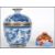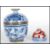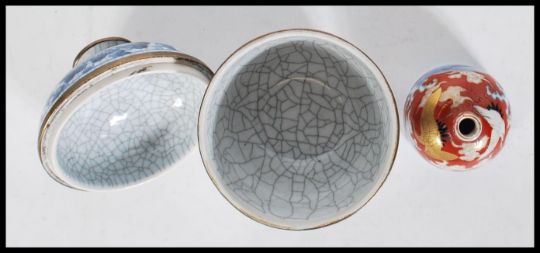 A Chinese hand painted blue and white crackle glazed lidded pot / cup and cover having brass rims and four character marks to the base together with a Japanese imari ink pot having hand painted cranes and landscape decoration with character marks to the base. Lidded pot measures 11cm tall, ink pot measures 4cm tall.