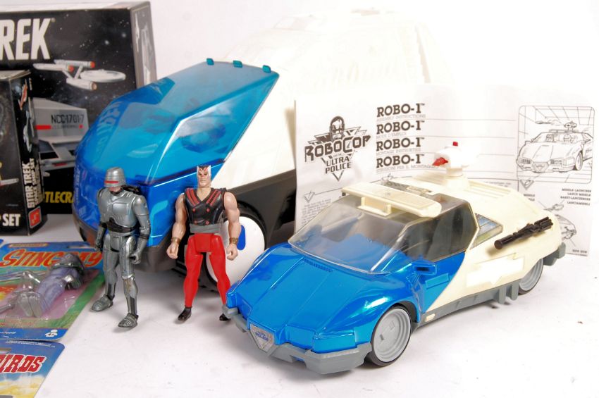 A collection of assorted vintage 1980's toys to include; Kenner Orion Robocop figures & vehicles, Matchbox Thunderbirds Virgil Tracy & The Hood carded figures, Matchbox Stingray Troy Tempest & Titan carded figures, amt ERTL Star trek Space Ship Set & special edition Galileo II Shuttlecraft and a Tai Fong 556 Robochange.
