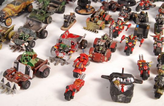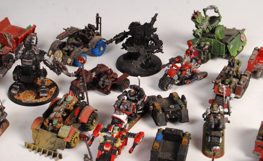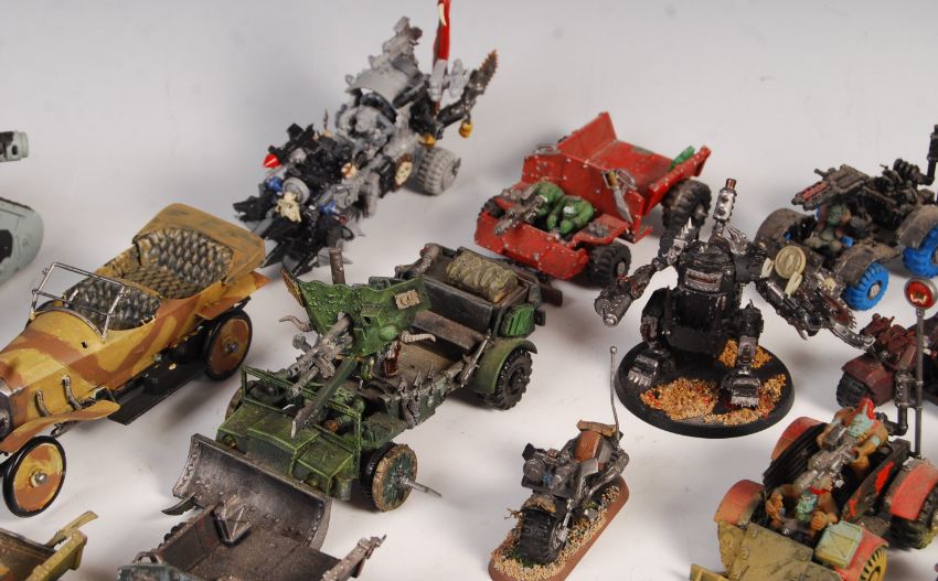 Warhammer - A collection of assorted vintage Games Workshop ' Warhammer ' war gaming figure vehicles - various tanks, motorcycles, and machines present - Stompa, War Buggy, Chaplin, Battle Tank, Landspeeder, Razorback etc. All made, largely painted to a good standard.