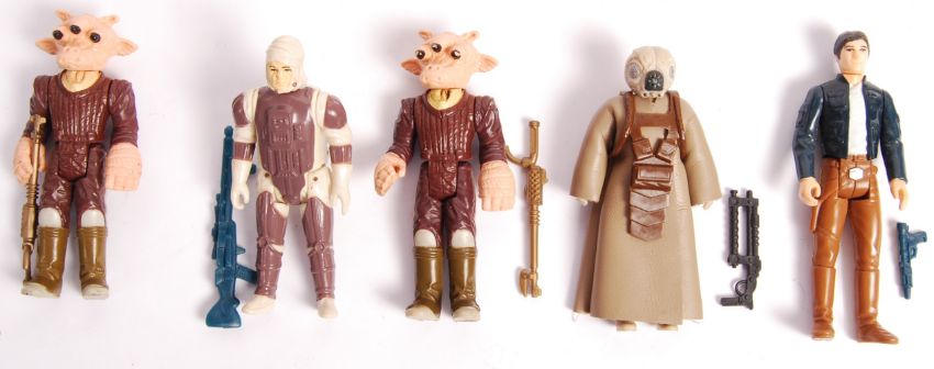A good collection of x5 original vintage Palitoy / Kenner Star Wars action figures. All with their original weapons. To include; Dengar (1980 Hong Kong COO), Ree Yees (LFL 83 Taiwan COO) x2, Han Solo (1980 LFL, No COO), and Zuckuss (LFL 1981, Hong Kong COO). Great collection, all generally played with but mint.