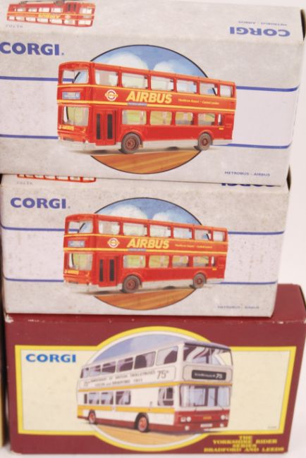A collection of 10x Corgi boxed diecast model buses comprising: 91912, 91859, 91853, 91706, 91702 x2, 97050 double pack, 91917, 91918 and 91919. All appearing mint in good original boxes. Good collection.