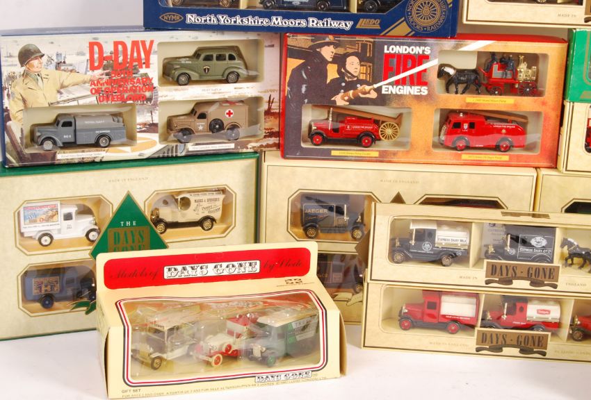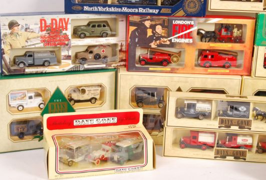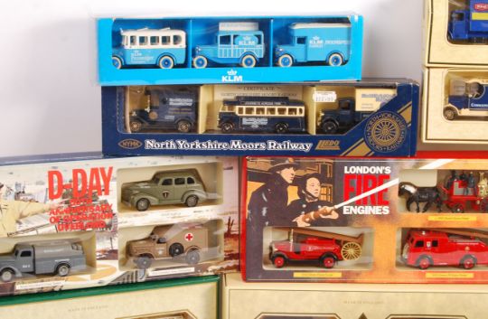 A collection of 15x assorted Lledo made gift sets / special edition sets. Each containing x3 diecast models. Various themes, to include: D-Day 50th Anniversary, London's Fire Engines, KLM, North Yorkshire Moors Railway, Marks & Spencer Collection and others. All contents appearing mint.