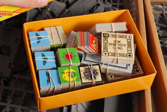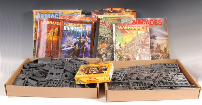 Warhammer - a large collection of assorted Games Workshop / Citadel made Warhammer tabletop gaming figures. Huge quantity of partly-used sprues, containing unused and unpainted figures - Lord Of The Rings noted. Along with assorted boxed sets, books, and games to include Space Marines Epic, Real Of Chaos, Battle For Armageddon etc. Contents not guaranteed. Great selection.