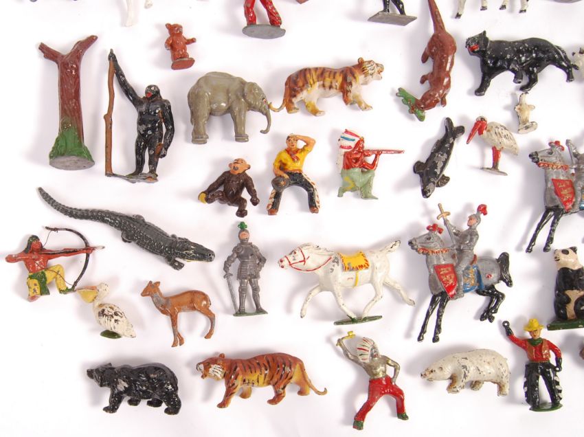 A very good collection of assorted vintage Cherilea / Britains / Charbens / Johillco and other lead figures, soldiers and farm animals. To include; Cherilea Knights, Britains soldiers (British and French), various mounted cowboys and Indians, Britains farm and zoo animals (some with accessories). Largely all good to very good. A very interesting collection of lead figures.