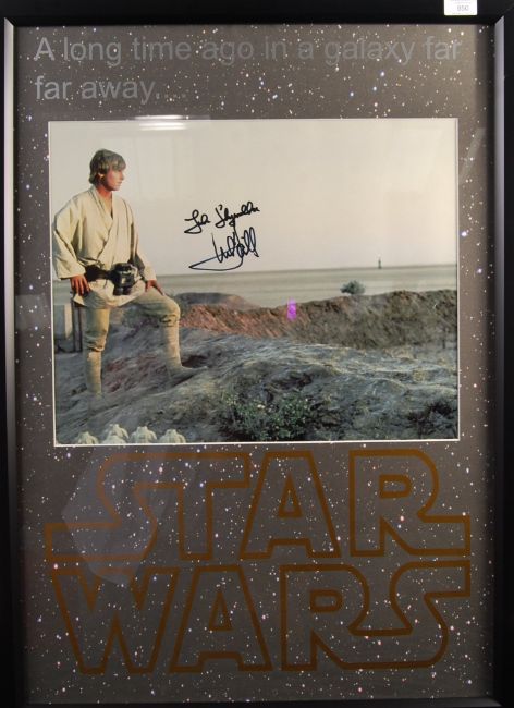 Star Wars - a stunning autographed photograph of Mark Hamill as Luke Skywalker in Star Wars. The large 16x20" colour photograph beautifully signed by Hamill in black marker to a light portion in the centre. Hamill has added ' Luke Skywalker ' to his autograph. Professionally framed and glazed, with an incredible ' Star Wars - A long time ago in a galaxy far far away....' mount. Total size: 87cm x 63cm. Obtained in person by the vendor at ExCeL London, at one of Hamill's first convention appearances in the UK. A rare and beautiful presentation from the popular film franchise.