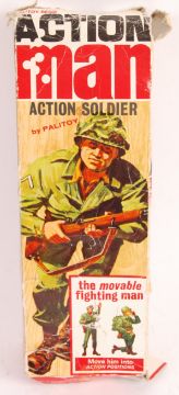 An original vintage Palitoy made ' Action Man ' 12" soldier figure. Rarer painted-head variation, blonde. With outfit. Original box present (tatty), and some small accessories also present.