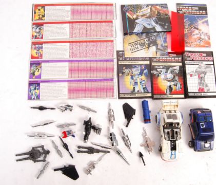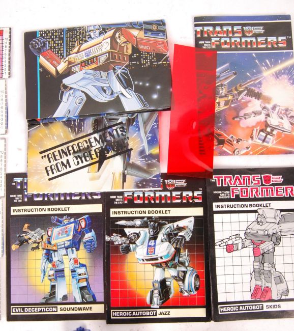A collection of original vintage Hasbro Transformers weapons and accessories to include approx 24x accessories with six instructions and five schematics with red reading strip. Also two Transformers figures (AF)  Good collection.