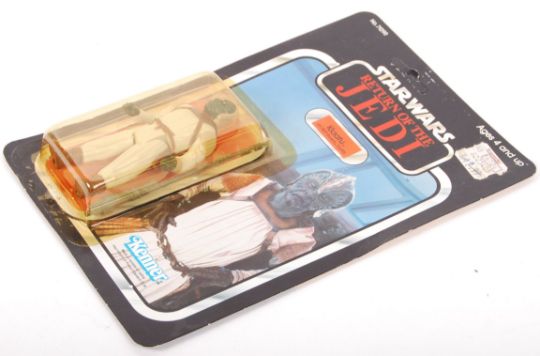 An original vintage Kenner made Star Wars carded MOC action figure ' Klaatu - In Skiff Guard Outfit '. On It's original 77 back Return of The Jedi card.  Figure remains factory sealed and unopened bubble slightly yellowed, but no dings or splits. Upon the original card back. Card with some light veining, but remains unpunched. Very nice example.