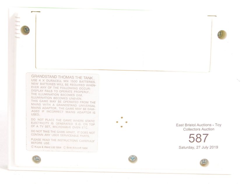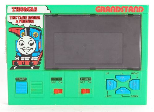 A rare original vintage 1980's Grandstand made Thomas The Tank Engine electronic handheld game / game console. Complete with original power supply and battery cover to verso. Condition is very good with vibrant colours and original warning labels present. Made in Japan to reverse. Appears to power up and work correctly.