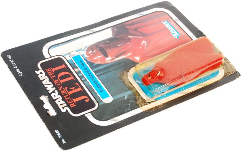 An original vintage Kenner made Star Wars MOC carded action figure ' Emperor's Royal Guard '. 65 back Return Of The Jedi card. Figure mint+ and untouched. Card very good, but some light wear around hanger and along the bottom edge, with slight bubble lift to said edge. Generally good to very good overall.