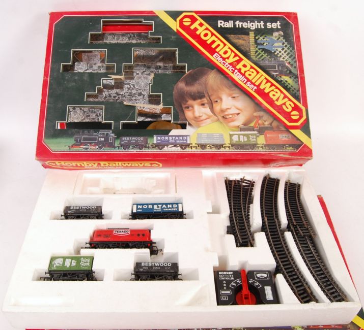 A collection of x3 vintage Hornby Railways 00 gauge model railway sets. ' High Speed Set ', ' Rail Freight Set ', and ' Freightmaster Set '. All appear largely complete in terms of locomotives / wagons (Railfreight Set with no locomotive), but may be missing some other track / accessory elements. All boxed.