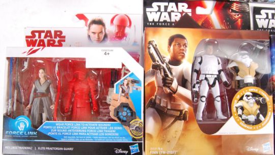 A collection of Hasbro Star Wars carded action figures comprising: 2x Moroff with Scarif Stormtrooper Squad Leader, Stormtrooper Officer with Poe Dameron, Rey with Elite Praetorian Guard, Armour Up Kylo Ren, Poe Dameron and Finn. All figures appearing ex shop stock mint in original packaging.